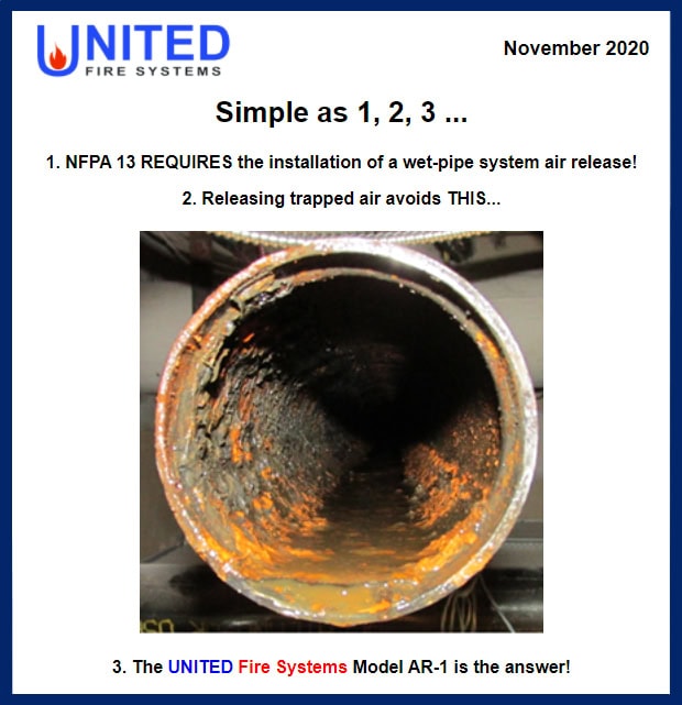 The FM Approved UNITED Fire Systems Model AR-1 Wet-Pipe Fire Sprinkler System Air Release is the answer for avoiding wet-pipe system internal corrosion AND complying with NFPA 13.